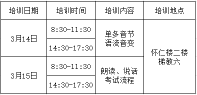 1.测试日期为3月21日的考生,培训时间为:3月14日—3月15日,8:30-11:30,14:30-17:30。培训形式为线下培训(16学时)。培训地点为漳州城市职业学院。请考生务必携带准考证参加培训,车辆一律不得入校。培训功课表如下: