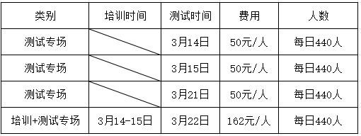(2)培训+测试专场收费:培训费 112 元/人,测试费 50 元/人,合计 162 元/人。