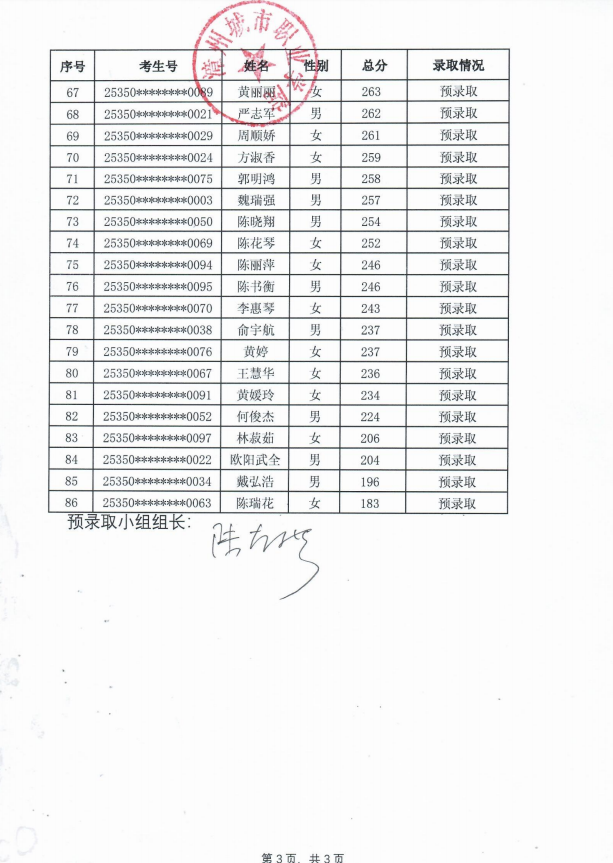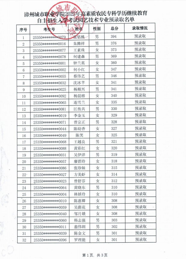 根据《福建省教育厅关于做好2025年全国成人高校招生工作的通知(闽教学〔2025〕10号)要求,我院于2025 年10月19日举办高素质农民专科学历继续教育自主招生入学考试。根据招生计划人数和入学考试总成绩“从高分到低分依次录取”的原则,经学院研究决定,我院 2025年高素质农民专科学历教育自主招生考试预录取学生86名,具体名单见附件。现将预录取名单予以公示,公示期:2025年11月26日至11月30日,如有异议,请在公示期间内上班时间向我院继续教育中心反映,电话:0596-2523373