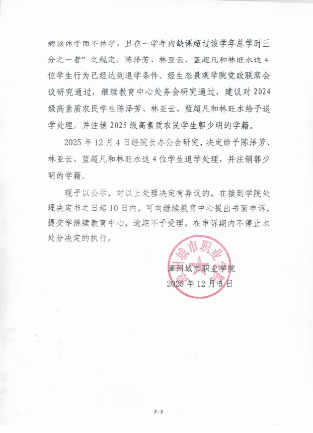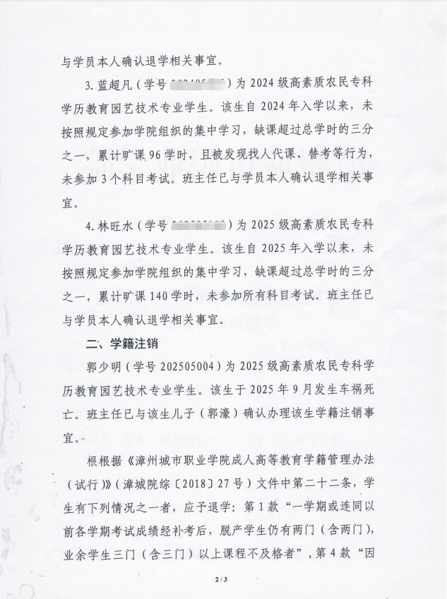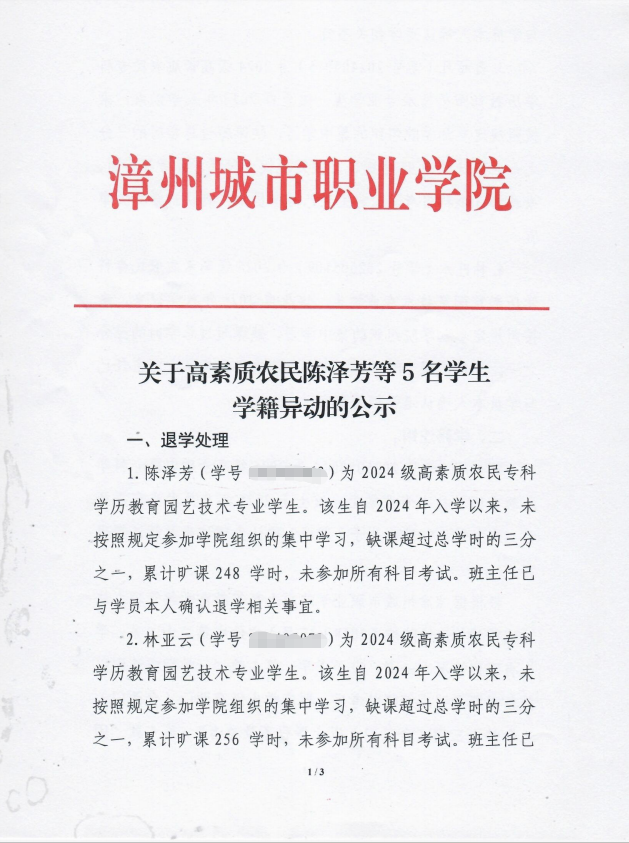 关于高素质农民陈泽芳等5名学生学籍异动的公示