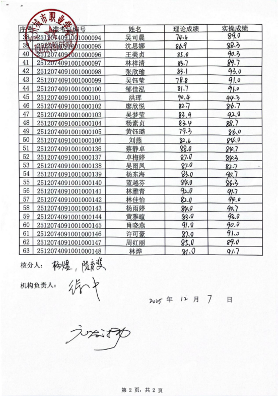 根据《福建省职业技能鉴定指导中心关于印发<福建省职业技能等级认定考务实施办法(试行)>》的通知有关要求,现将2025年12月7日职业技能等级认定成绩予以公示(详见附件)。公示期自2025年12月16日-2025年12月23日,公示期内,如有异议,请及时与我们联系。