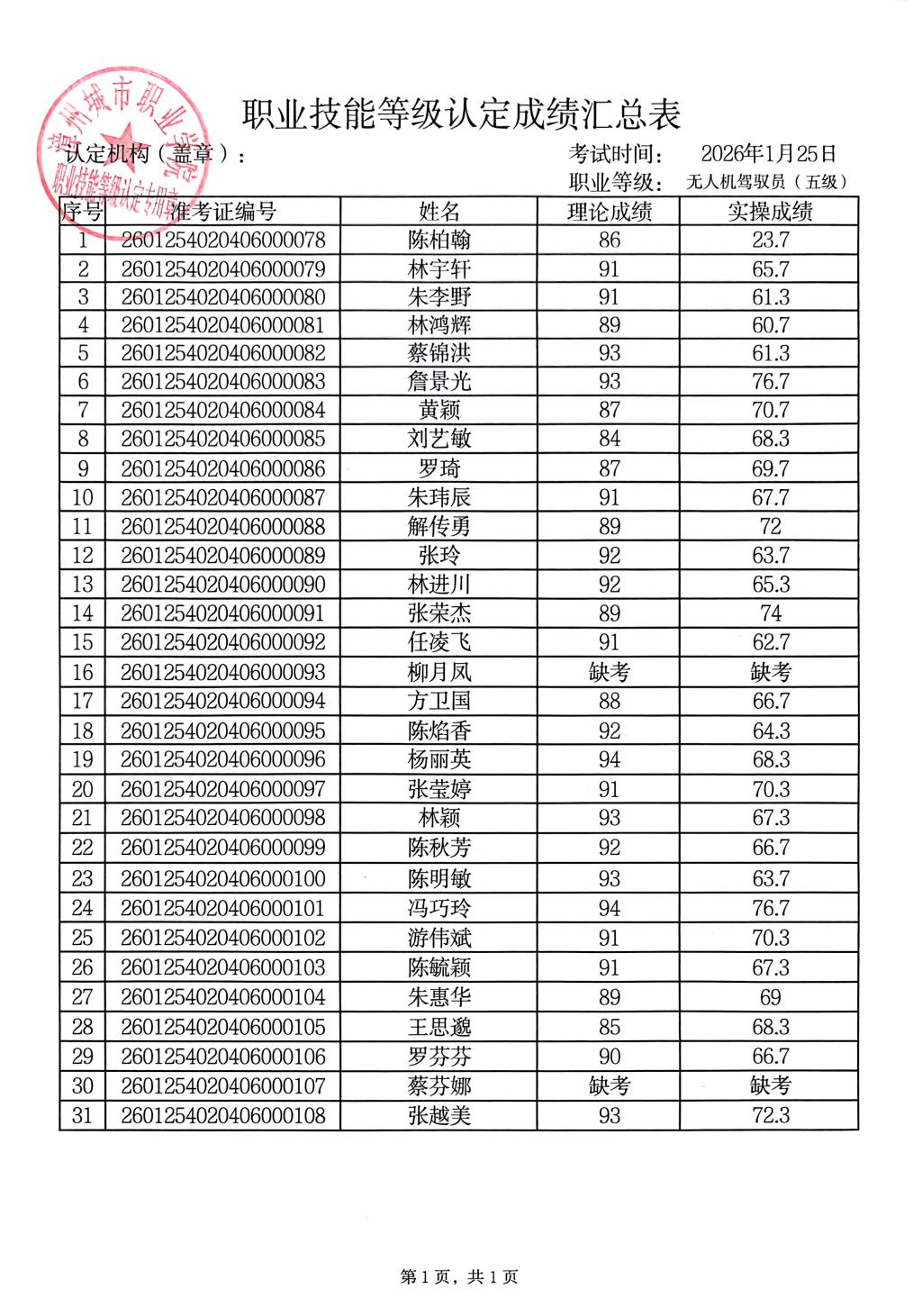 根据《福建省职业技能鉴定指导中心关于印发<福建省职业技能等级认定考务实施办法(试行)>》的通知有关要求,现将2026年1月25日职业技能等级认定成绩予以公示(详见附件)。公示期自2026年1月26日-2026年1月30日,公示期内,如有异议,请及时与我们联系。